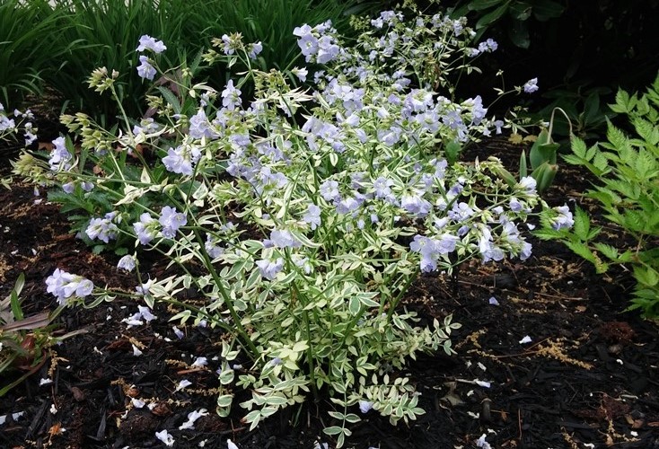 Polemonium (Jacob’s Ladder)This charming native has delicate lacy leaves that form low mounds. It was nicknamed Jacob’s Ladder because of the arrangement of their leaves — pairs of opposite leaflets that supposedly resembled the ladder that the biblical patriarch Jacob dreamed stretched up to heaven from earth. Both the foliage and flowers are eye-candy. Foliage can be solid green, variegated or dark purple. Flowers are usually lavender-blue or white. Polemonium prefers sun to part shade (more shade in warmer zones) and ranges in height from 12”-24”. Some of my favorite cultivars are ‘Stairway to Heaven’ (pictured), ‘Bressingham Purple’, ‘Purple Rain’ and ‘Apricot Delight’ (apricot-pink flowers). It is hardy in Zones 3 – 8 and rarely bothered by deer or rabbits. Photo taken in my Maine garden